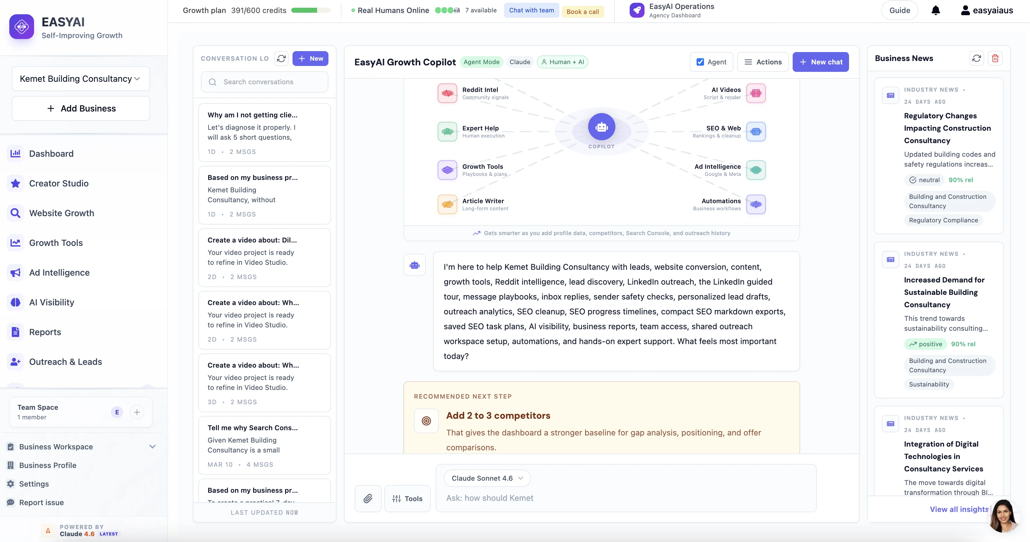 EASYAI is an AI-powered growth platform that combines specialist AI agents with human experts. It handles your content creation, SEO, outreach, ad strategy, and CRM — all from one workspace. Think of it as hiring an entire marketing team controlled by AI and backed by real experts.